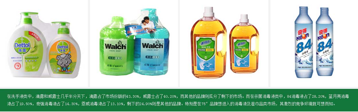 在衛(wèi)生消毒產(chǎn)品領(lǐng)域,品牌競爭非常激烈,消毒液以及濕巾兩大品類難以突圍。而75°品牌的競爭對(duì)手主要有洗手液類、殺菌消毒液、免水潔手液和護(hù)理濕巾類四大類,目前競爭的四大品類細(xì)分市場中,每一個(gè)領(lǐng)域都有絕對(duì)的領(lǐng)導(dǎo)者或強(qiáng)勢(shì)品牌。