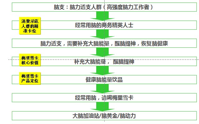 我們的策略就是借用紅牛、東鵬功效賣點,爭奪“高端健康能量飲品“ 這一消費者心智資源。借力紅牛、東鵬”困了累了“消費者心智之力,重拳打擊紅牛、東鵬化學非健康之實,提升“高端健康能量飲品“之譽。梅里雪卡要做的不是在功能賣點是競爭,而是要在此基礎上為消費者多一款高端健康能量飲品的選擇,爭的是”高端健康能量飲品心智“之位。