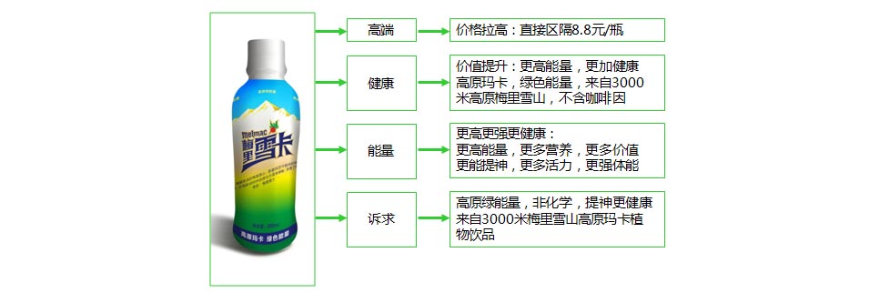 來自高原的瑪卡能量,綠色天然、安全健康、多喝養生,而目前統治市場以紅牛為主的能量飲品,主要是化學勾兌、含咖啡因、有害健康。因此,梅里雪卡深層次品牌內涵是“高端健康能量,更能提神更加健康的能量“。
