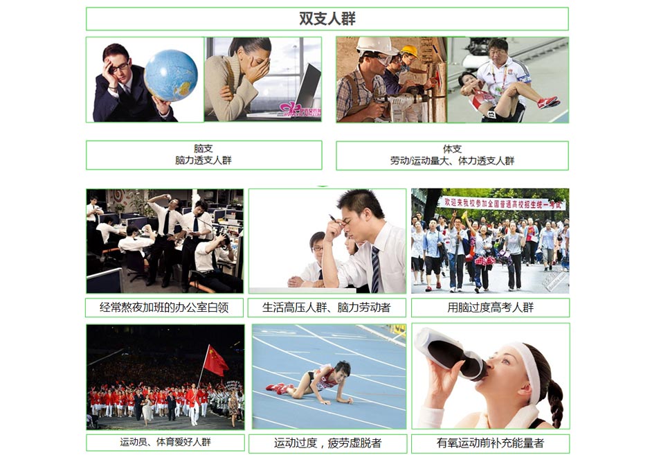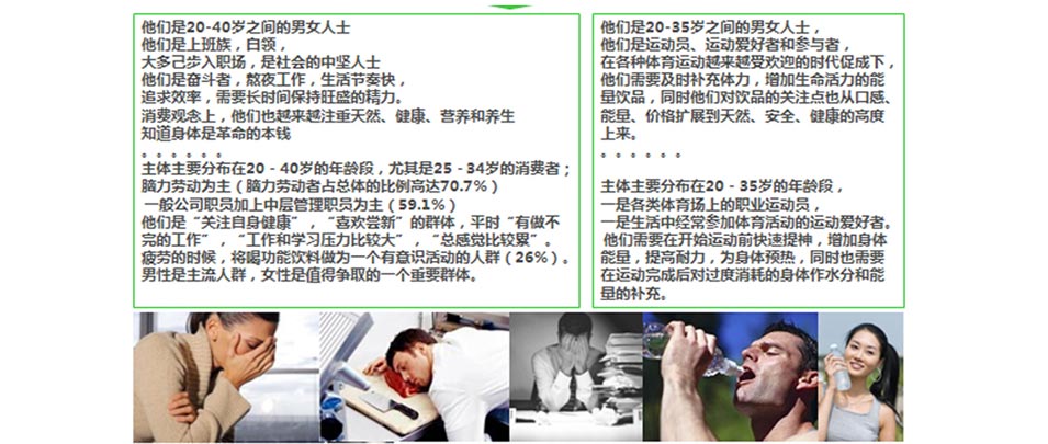 他們的都是20-40歲的城市白領,新富階層以及運動員等,都屬于腦力透支或者體力透支的雙支人群。共同特征:他們關注的是能量飲料的品質、健康、效果等因素。