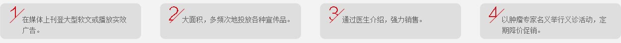 在目標醫院所有病床、門診派發報紙與宣傳品。保證產品在目標醫院內的知名度,讓患者始終對產品保持感性認識。與目標醫院的有關人員溝通,了解收集住院病人的基本情況,建立目標醫院的所有病人檔案和重點消費者檔案。對患者必須保證每周一次的電話訪問和產品及家庭護理知識資料的郵寄。資料主要以產品的權威性,科技含量,以及其它科技論文,最新治療方法等為主,附以一些家庭護理知識。軟性提高他們對產品的信任度。