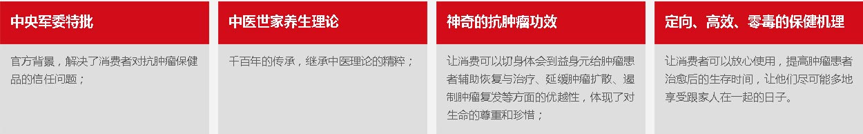 在生命的尊嚴面前,所有的承諾和安慰都變得如此無奈,只有找到切實可行的治療方法或者藥物,才能激發換種重生的信念,減輕親人因害怕失去的痛苦,花多少錢已經成為一個符號。選一款信得過的抗腫瘤保健品,擺脫腫瘤給患者本人和家庭親人帶來的痛苦與無助,是益身元的目標消費者最主要的需求!
