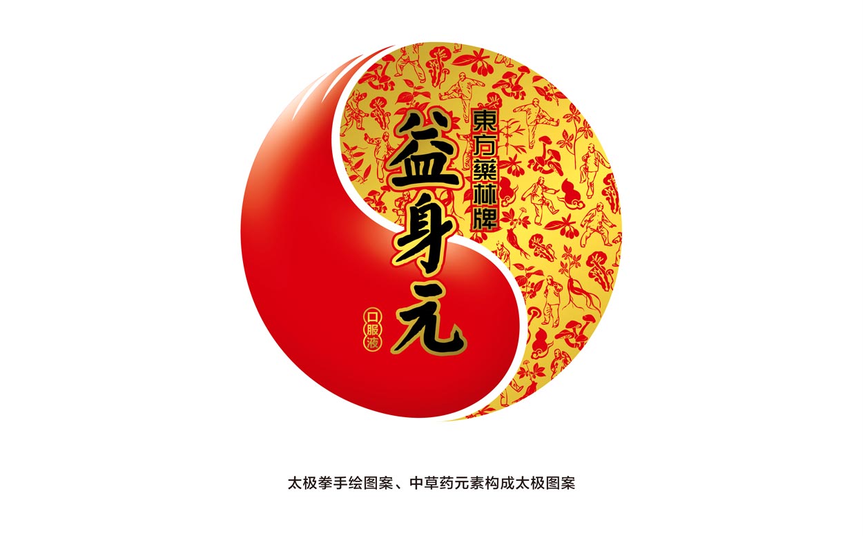 采用正紅色作為包裝的主色,體現了產品的的健康、活力的形象,而且更符合中國傳統文化的審美觀。在包裝上,為了呼應“天圓地方”“太極”的形象設計,在正紅包裝的背景上,加上了“太極人”“分解漢字”的剪影,相映成輝。