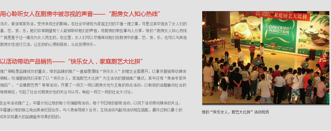 據調查了解,一個家庭主婦,每天約有四分之一的時間在廚房里度過,專職太太花費的時間甚至更多,因此,中擂建議,綠的鍋具把關心女人廚房生活的質量,女人們廚房的喜、怒、哀、樂作為自己的品牌使命,體現綠的承擔“關心女人”的責任,提高品牌形象。中擂通過對1000多名家庭主婦的調查了解后,從女人的角度出發,發出的“體貼女人、理解女人”號召,做女人的知心朋友,學會聆聽她們的聲音。廚房的事依舊是雞毛蒜皮的事,可是綠的讓它變得不再無人問津,不再平淡如水。正是綠的,為女人著想,從理解、關心、愛護廚房中的女人角度出發,提出“讓女人在廚房中快樂起來”的品牌核心主張,成功與國內自主品牌甚至國際高端品牌區分開來。