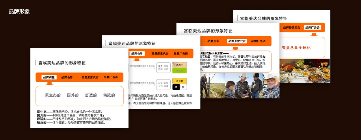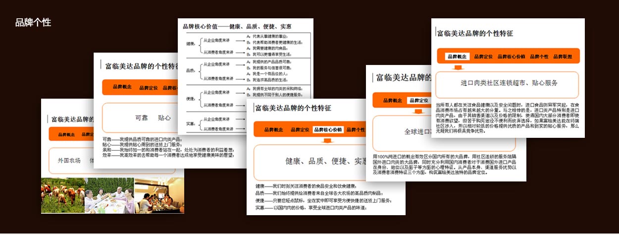 中擂認為,富臨美達用100%純進口的概念能有效區分國內所有的大品牌。通過走進社區,用社區連鎖的服務阻隔國外進口肉類的大品牌,同時充分利用國內消費者對于消費國外進口產品在身份、地位以及面子等方面的心理特征。從產品本身、渠道服務優勢以及消費者消費特征三個方面,構筑富臨美達獨特的品牌定位。又從品牌調性、色彩等方面塑造起富臨美達獨一無二的品牌形象。