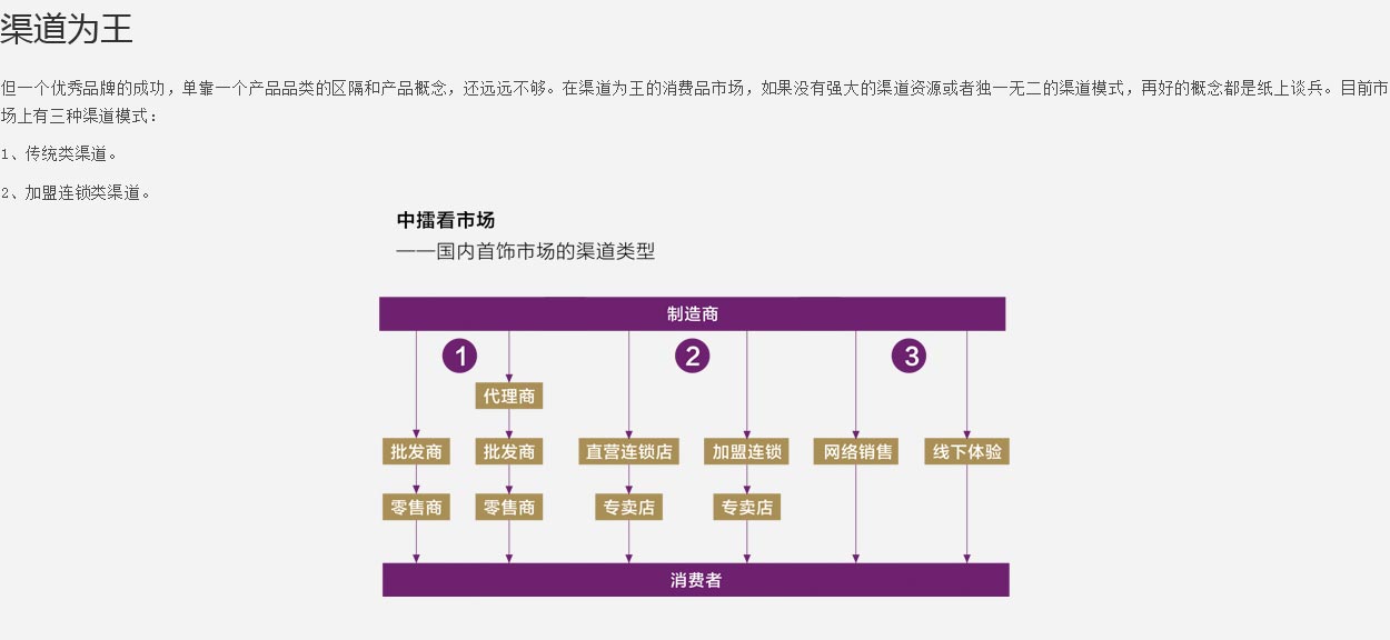 傳統類渠道的渠道長度過長,對于一個新起步的品牌,勢必要投入大量的人力物力拓展和開發管理渠道,在信息化的時代,對于一個流行時尚的產品品牌,也許還沒有等我們鋪好渠道,其他競爭對手已經把我們拋在了身后;另外,由如果渠道成員的層級過多,勢必會分掉企業的大部分利潤,最終變成企業為渠道商打工。 加盟連鎖類渠道是目前首飾類產品的主流銷售渠道模式,其在經歷了多年的運作發展,已經趨于成熟,但選擇連鎖加盟的方式在市場運作初期的投入比較大,特別是對于一個新生的品牌,如何處理加盟商的信任問題,是每一個做連鎖企業最頭痛的問題,同時對于加盟商的培訓管理也是一個難題。 最后一個是網購渠道。網購市場的興起已成為推動首飾市場發展的趨勢之一,網購作為一種新興的商業模式,已經被越來越多的企業和消費者認可和接受,同時也有很多成功的企業家嘗到甜頭(如鉆石小鳥)。中擂因此認為,卡曼芙作為一個新興品牌,走網購渠道,可以減少資本的投入,又能減低風險,花小錢就能把渠道鋪向全國各地。
