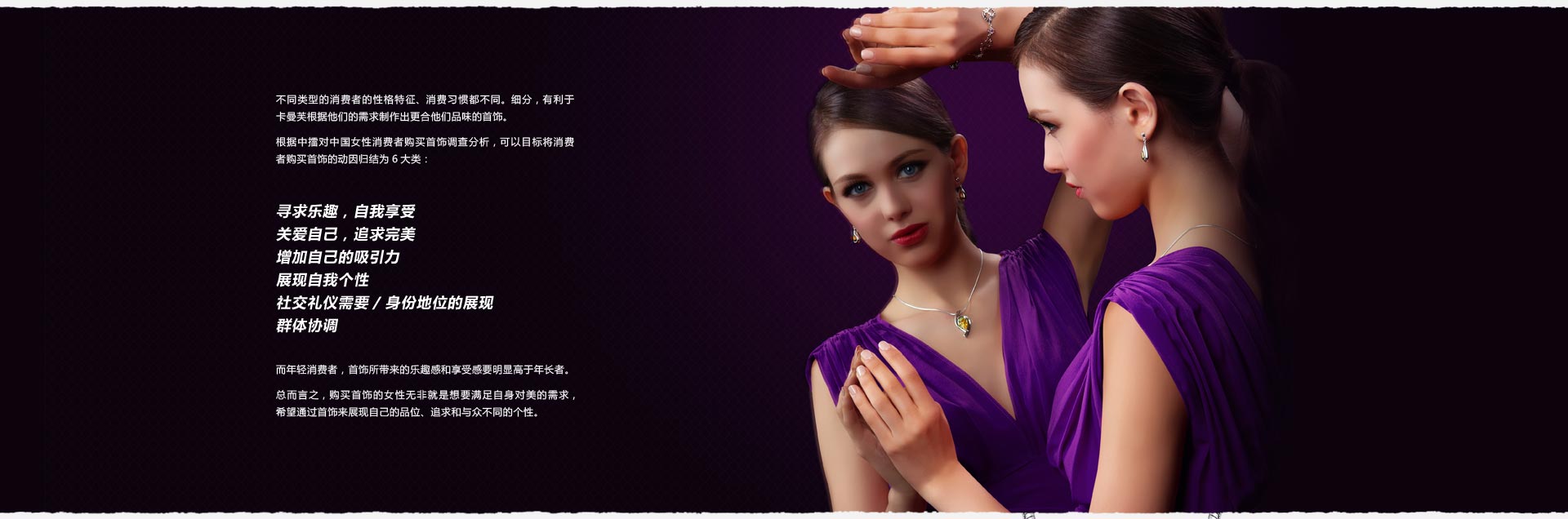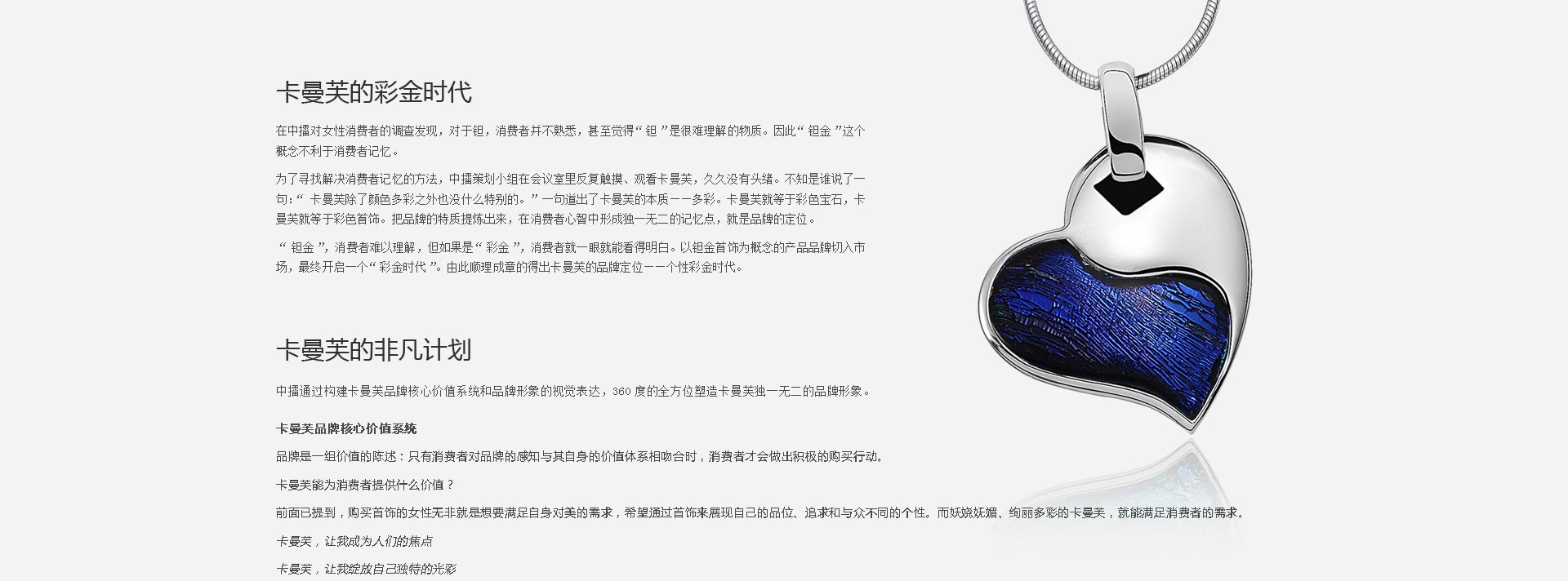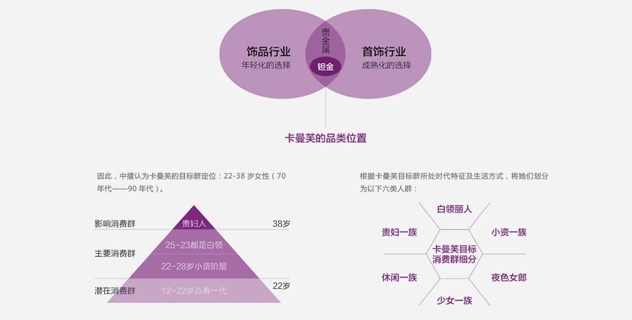 中擂通過對首飾市場的分析、目標消費人群的消費特點分析,緊緊抓住目標消費人群的情感需求和功能需求,構建卡曼芙品牌核心價值系統和品牌形象的視覺表達,360度的全方位塑造與眾不同的卡曼芙彩金首飾品牌及其獨特的時尚文化,以網購渠道密碼開啟中國彩金首飾時代,并最終贏得國內首飾中高端市場。