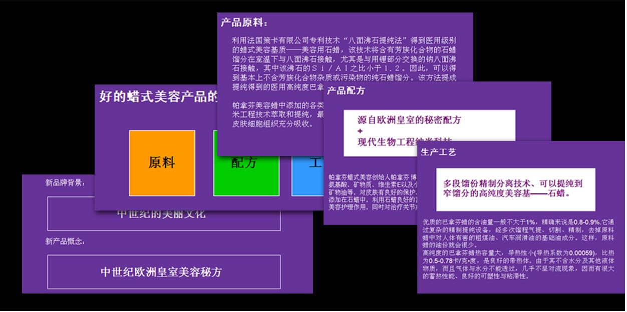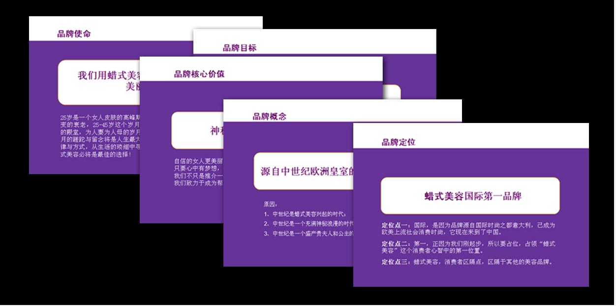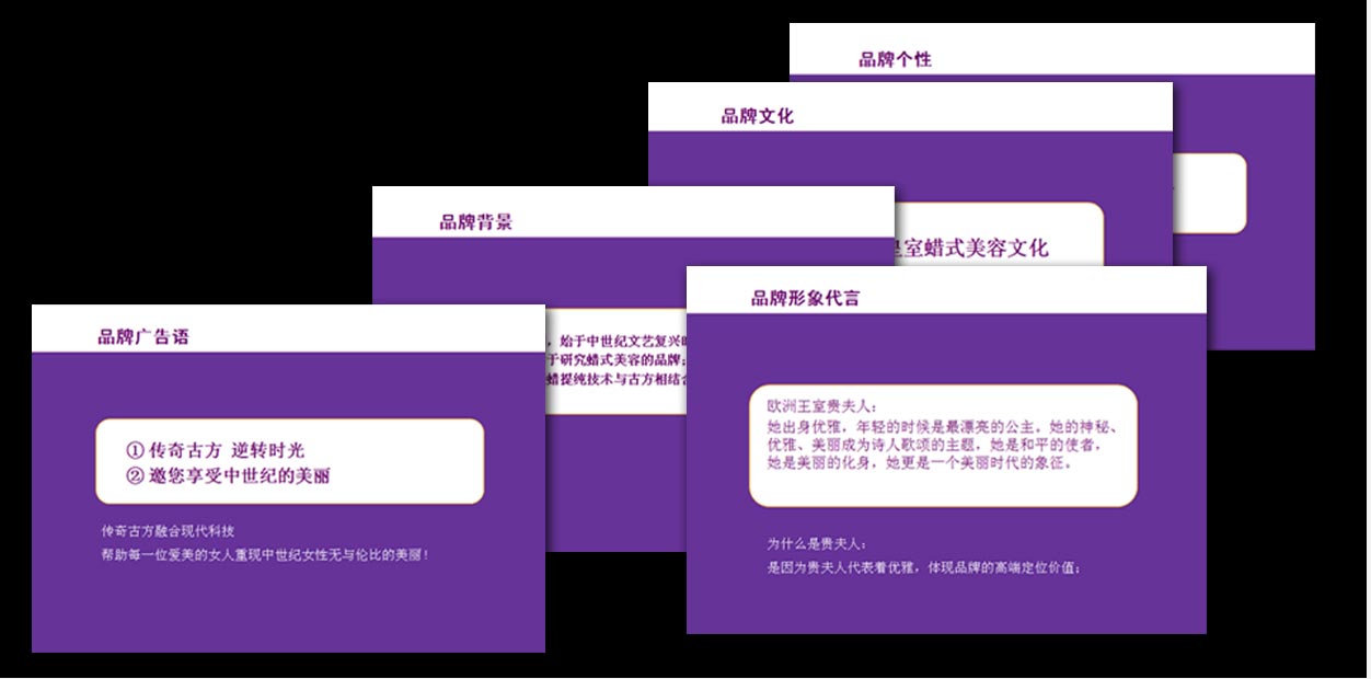 通過上面的分析我們基本是可以確定品牌將要走的方向:以中世紀的美麗文化為品牌背景,打古方秘制蠟式美容產(chǎn)品概念牌。