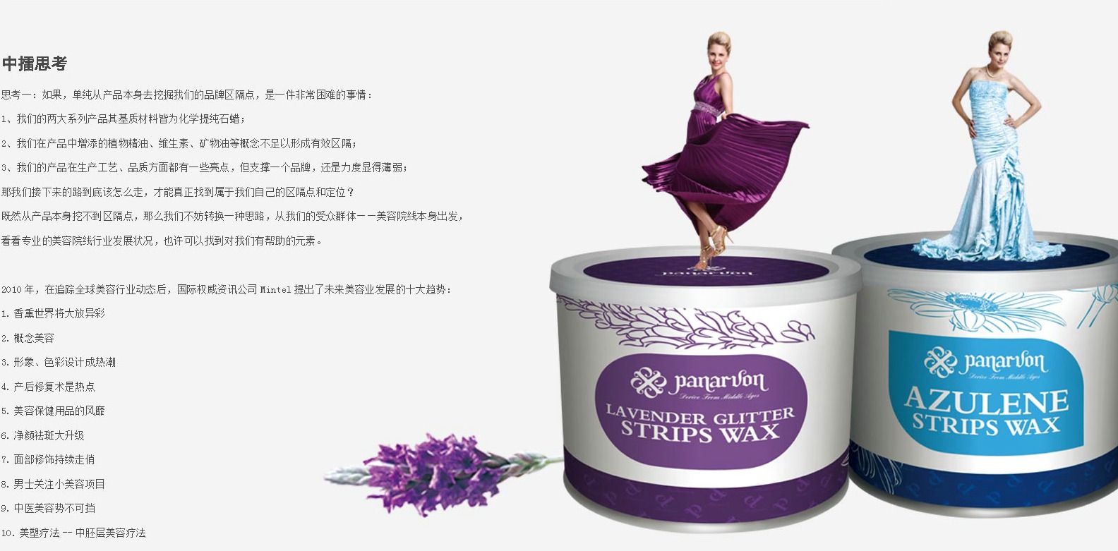 我們得出一個結(jié)論,在美容用蠟這個藍海市場,雖然目前市場上有很多的蠟制美容產(chǎn)品,但大家都集中在各自產(chǎn)品的圈子,而沒有一個品牌站在一種美容文化——“蠟式美容”的角度去主導整個市場潮流。那么,我們可不可以成為第一個吃螃蟹的人?答案是肯定的!