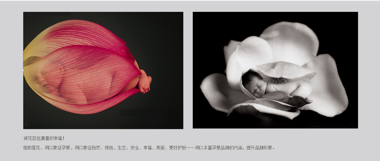 中擂以蓮花做為品牌圖騰,提煉蓮花的精神理念,做為孕愛品牌的形象價值聯(lián)接點!將蓮花描述成一個舒適搖籃。被花瓣包裹的孩兒,可以安全入睡。體現(xiàn)出孕愛簡約、時尚、安全的調(diào)性。