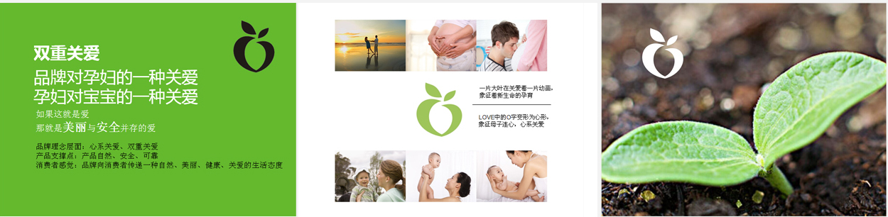 而嫩綠的標(biāo)準(zhǔn)色,向消費者傳達了一種自然、美麗、健康的生活態(tài)度。由花瓣組合而來的標(biāo)志,暗喻了母親猶如花朵般孕育著生命。標(biāo)志的外形,像是從中文字“孕”的上半部分演化而來,還像是爸爸媽媽的兩雙手,雙重保護著還在子宮內(nèi)生長的孩子。寓意著孕愛能為母親和寶寶雙重關(guān)愛、雙重保護。