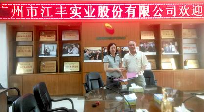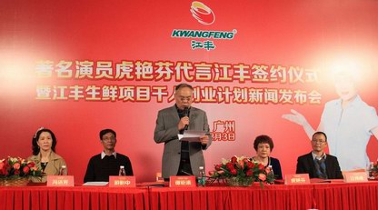 2015年2月3日,廣州市江豐實業股份有限公司與廣東電視臺明星欄目“外來媳婦本地郎”的女主角虎艷芬女士舉行了一場簡單而隆重的簽約儀式,屆時,正式聘請虎艷芬女士為江豐的品牌代言人。同日,江豐宣布啟動生鮮項目千人創業計劃,希望通過結合禽類企業、雞檔主、創業投資者、銀行等眾家之所長,共同推動生鮮雞產業跨越式發展。