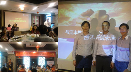 2015年4月17日,廣州市江豐實業股份有限公司特約經銷點招商大會在廣州市越秀區隆重舉行。同時,江豐品牌戰略合作伙伴CCBD中擂的總經理黃文海先生也應邀出席,為江豐助力。通過此次招商大會,大家不僅對生鮮雞和江豐有了更多更深入的了解,更恢復了對生鮮雞市場的信心,市場反應熱烈,大家紛紛表示愿意和江豐合作,實現共贏!