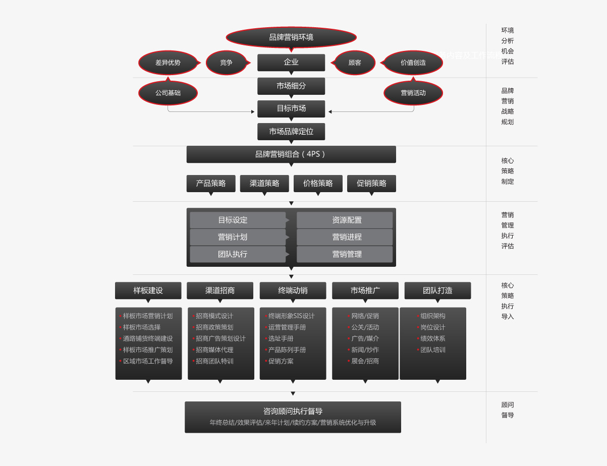 | 市場(chǎng)細(xì)分 | 規(guī)劃投資組合 | 品牌目標(biāo) | 產(chǎn)品計(jì)劃 | 渠道模式 | 品牌包裝 | 產(chǎn)品組合 | 價(jià)格體系 | 渠道政策 | 終端管理 | 招商工具 | 創(chuàng)意執(zhí)行 | 績(jī)效體系 | 市場(chǎng)督導(dǎo) | |