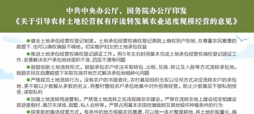 原標(biāo)題:農(nóng)村土地流轉(zhuǎn) 用五年時(shí)間完成確權(quán)頒證 培育新型農(nóng)業(yè)經(jīng)營(yíng)主體——專家詳解農(nóng)村土地流轉(zhuǎn)及農(nóng)業(yè)適度規(guī)模經(jīng)營(yíng)(點(diǎn)擊查看大圖) 11月20日,《關(guān)于引導(dǎo)農(nóng)村土地經(jīng)營(yíng)權(quán)有序流轉(zhuǎn)發(fā)展農(nóng)業(yè)適度規(guī)模經(jīng)營(yíng)的意見》公布。推動(dòng)土地流轉(zhuǎn)、發(fā)展規(guī)模經(jīng)營(yíng)對(duì)當(dāng)前我國(guó)農(nóng)業(yè)生產(chǎn)有何意義?在推進(jìn)過程中,農(nóng)民的權(quán)益怎么保證?如何避免工商資本進(jìn)入農(nóng)村后造成非糧化…